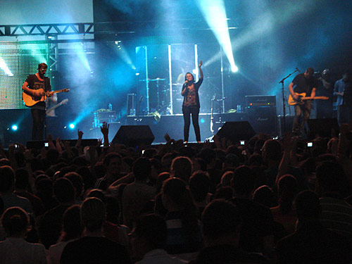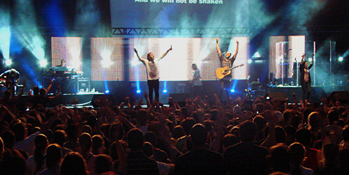 Na noite desta sexta-feira, os australianos do Hillsong United mostraram porque não podem ser classificados como uma banda. HU não é uma banda. Não existe um vocalista, um baterista ou um guitarrista fixo: os componentes se revezam constantemente. Participa quem faz parte do grupo de jovens da Hillsong Church, em Sydney. Pra começar, eles não estavam lá para entreter ninguém, nem a si mesmos. Estavam todos juntos no Gigantinho – músicos e platéia – para celebrar alguém que não se pode ver, mas cuja presença era inegável. Luzes, som alto, músicas dançantes? Claro, o show tinha isso tudo. O diferencial eram as letras, cristãs em sua mais pura essência.